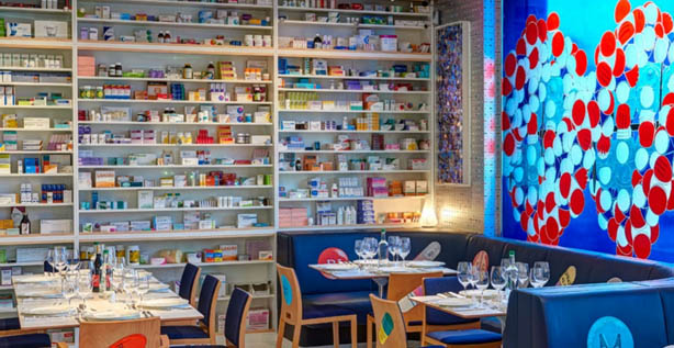 El local cuenta con un catálogo de medicamentos, menús con forma de prescripciones médicas y muros decorados con píldoras.