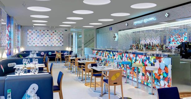 El local está ubicado dentro de la galería de arte Newport Street Gallery, en Londres, y cuenta con un catálogo de medicamentos, menús con forma de prescripciones médicas y muros decorados con píldoras.