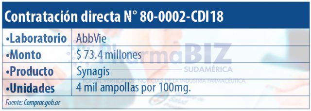 A través de la decisión administrativa 987, el Estado desembolsará $73.4 millones (u$s 3.1 millones) en concepto de la venta de 4 mil frascos ampollas por 100 miligramos del anticuerpo monoclonal Synagis, indicado para la prevención de la infección por virus sincicial respiratorio -VSR- en bebés nacidos prematuros o con cardiopatías congénitas. Ver decisión