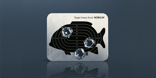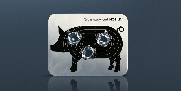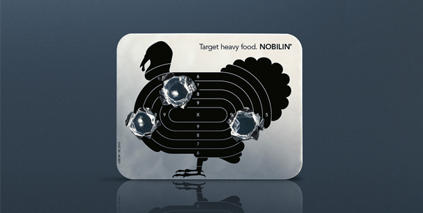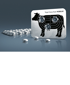 Los dorsos de los blísters son tableros de tiro al blanco con forma de animal: vaca, cerdo, pez, y pollo, y con agujeros que muestran cómo Nobilin ataca lo que comemos y ayuda a hacer la digestión.