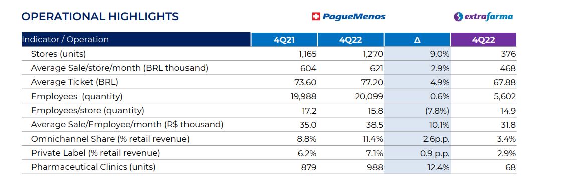 Al 31 de diciembre, Pague Menos tenía 1.270 tiendas distribuidas en 348 municipios, de las cuales 988 incluían el concepto Clinic Farma. A nivel nacional, en 2022 su market share creció en 0.6 puntos porcentuales al pasar de 5,4% a 6,0%. En tanto, su plantel de empleados ascendía a 20.099, un 0,6% más que los 19.998 que registraba a fines de 2021. Por su parte, Extrafarma totalizaba 376 locales con un staff de 5.603 colaboradores.