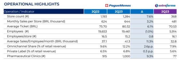 Al 30 de junio de 2023, la empresa tenía 1.284 tiendas distribuidas bajo la bandera Pague Menos en 356 municipios, de las cuales 1.000 incluían el concepto Clinic Farma. A nivel nacional, su market share trepó a 6%, en tanto, su plantel de empleados ascendía a 19.461, un -1,0% más que los 19.653 que registraba un año atrás. Ver Press Release