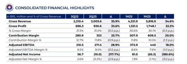 Pague Menos, la tercera red de farmacias más grande de Brasil con sede en Fortaleza, Ceará, exhibió un incremento del 34,6% en su facturación durante la primera mitad del año como consecuencia de la consolidación contable de la recientemente adquirida Extrafarma. Sus ventas ascendieron a R$ 5.816,9 millones (u$s 1.188 millones), frente a los R$ 4.321,9 millones (u$s 883 millones) que obtuvo en igual lapso de 2022.