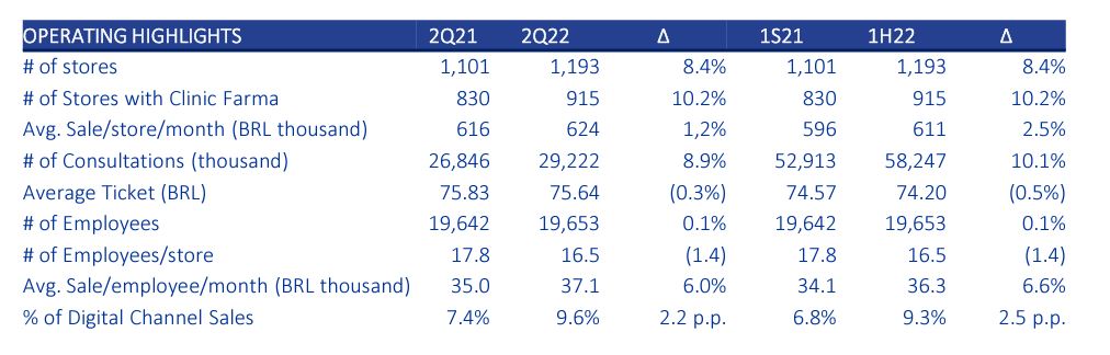 Al 30 de junio de 2022, la empresa tenía 1.193 tiendas distribuidas en 356 municipios, de las cuales 915 incluían el concepto Clinic Farma. A nivel nacional, su market share cayó en 0.4 puntos porcentuales, en tanto, su plantel de empleados ascendía a 19.653, un 0,1% más que los 19.642 que registraba un año atrás. Ver Press Release.