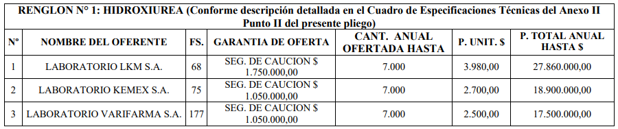 Según el desglose realizado por el equipo de analistas de Pharmabiz, la empresa que resultaría ganadora sería Varifarma en función de haber cotizado los precios más bajos. Así se haría de un total de $17.5 millones (u$s 409.6 mil). Ver acta de apertura