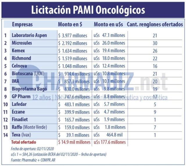 Otro que participa de la licitación que abrió el PAMI es el laboratorio Celnova que realizó una oferta parcial en 16 renglones por $1.048 millones (u$s 12.4 millones). También figuran el grupo Biotoscana que por medio de su brazo LKM podría percibir ingresos por $914.6 millones (u$s 10.8 millones); el laboratorio brasileño IMA que cotizó una suma de $857.1 millones (u$s 10.1 millones); y Bioprofarma Bagó, que solicitó un monto de $830.1 millones (u$s 9.8 millones) por los 19 renglones en los que se anotó.