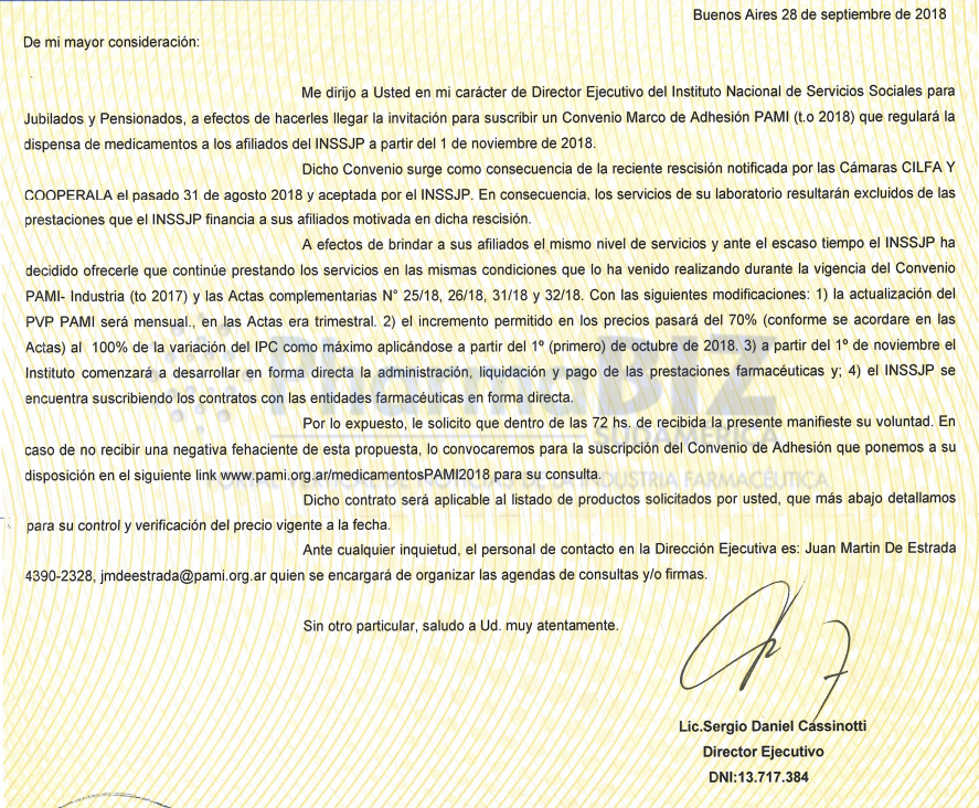 El acuerdo PAMI para la provisión de medicamentos sigue estancado. Pharmabiz publica en exclusiva la carta documento que la obra social le envió a los laboratorios durante esta semana intentando realizar negociaciones uno a uno.