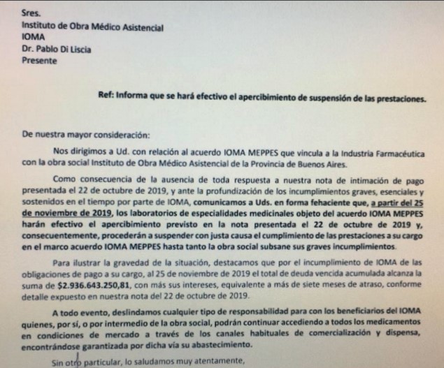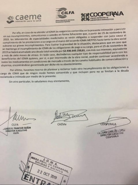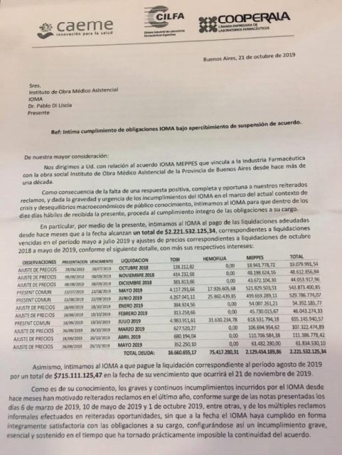 El PAMI, sin embargo, no es el único meollo por delante. Ayer las tres cámaras industriales CILFA, CAEMe y COOPERALA presentaron una nota formal ante el IOMA – la mayor obra social provincial – en la que dejaron constancia que «como consecuencia de la ausencia de toda respuesta a la nota de intimación de pago presentada el 22 de octubre de 2019» los laboratorios procedieron a suspender el cumplimiento de las prestaciones «hasta tanto la obra social subsane sus graves incumplimientos». Ver documento.