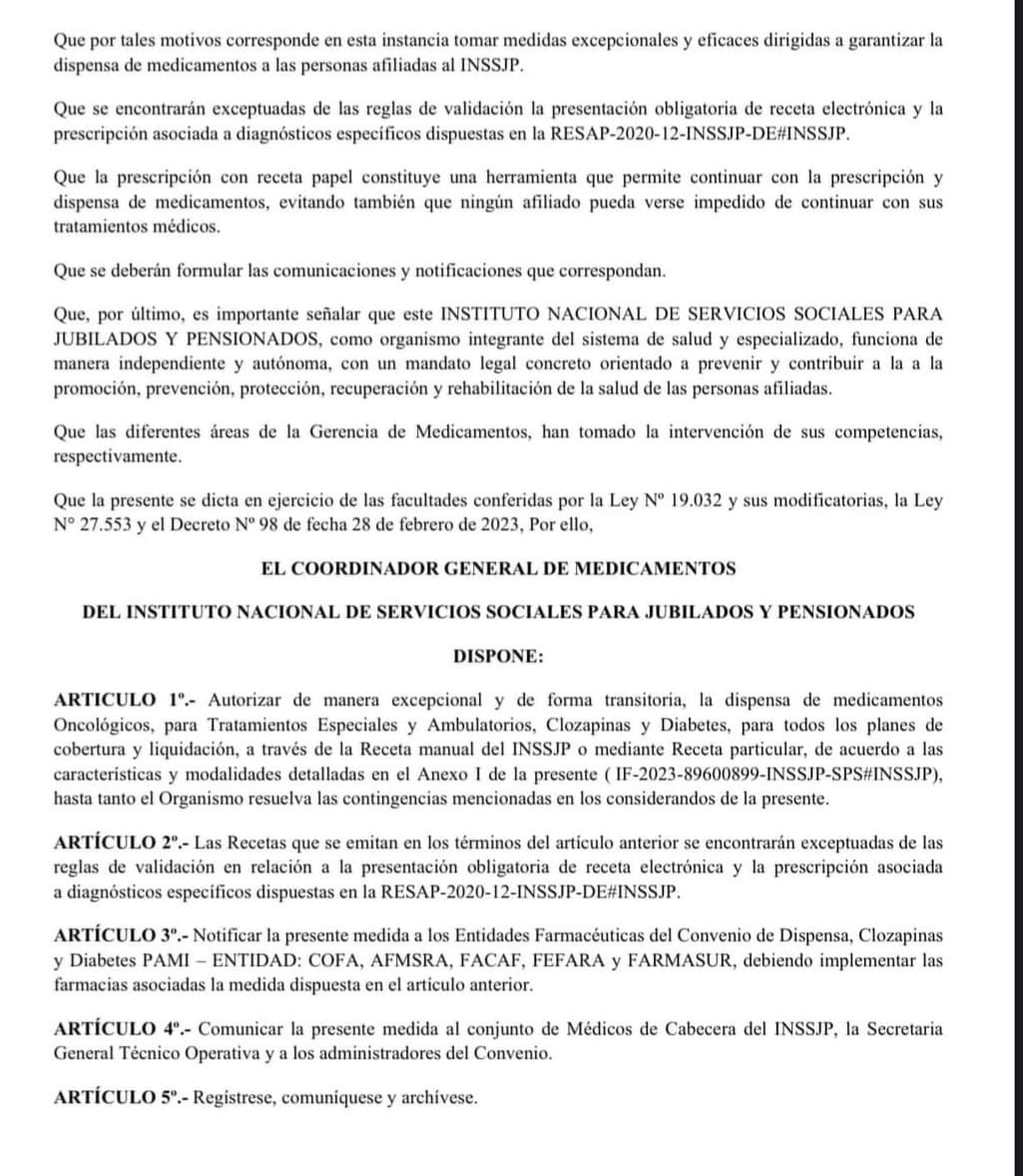 Según lo relevado por Pharmabiz, el PAMI emitió una disposición en la que autorizó de manera excepcional y transitoria varias cosas. Esto incluye la dispensa de medicamentos oncológicos para tratamientos especiales y ambulatorios, clozapinas y diabetes, para todos los planes de oberturas y liquidación, a través de la receta manual del INSSJP o mediante receta particular, hasta tanto el organismo resuelva las contingencias.