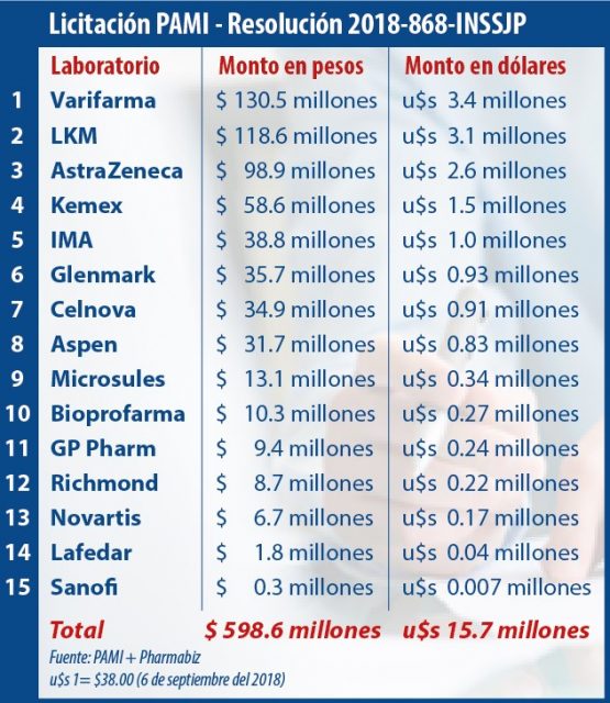 El pequeño laboratorio Celnova fue el ganador para cuatro medicamentos por un total de $34.9 millones (us$s 0.91 millones). Mientras que el nacional Aspen embolsará $31.7 millones (us$s 0.83 millones) ya que salió vencedor en cuatro renglones de la licitación.