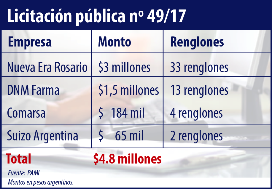 El PAMI oficializó esta semana quiénes fueron los ganadores de la compra. Por caso, la droguería Nueva Era Rosario logró vencer en 33 renglones por los cuales recibirá $3 millones (u$s 79.773); mientras que DNM Farma facturará cerca de $1.5 millones (u$s 40.368) y entregará productos para 13 renglones. En tanto a través de montos ínfimos, la droguería Comarsa colocará cuatro productos mediante $184.576 (u$s 4.835); y la droguería Suizo Argentina que logró ganar en 2 renglones, computará $65.636 (u$s 1.719).