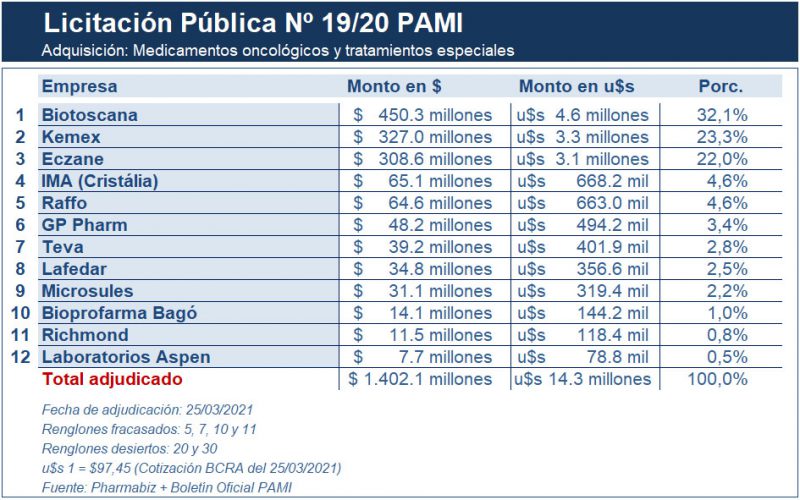 El PAMI adjudicó una mega contratación de oncológicos. Para esta compra, la obra social desembolsará $1.402 millones (u$s 14.3 millones). El grupo Biotoscana se constituyó en el principal adjudicatario consiguiendo un 32,1% de la licitación.