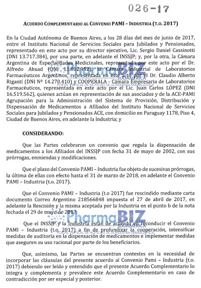En primer término, las partes declararon y ratificaron que el convenio PAMI-industria «se encuentra vigente en todas sus cláusulas y condiciones» y que su vencimiento se hará efectivo el 31 de marzo de 2018.