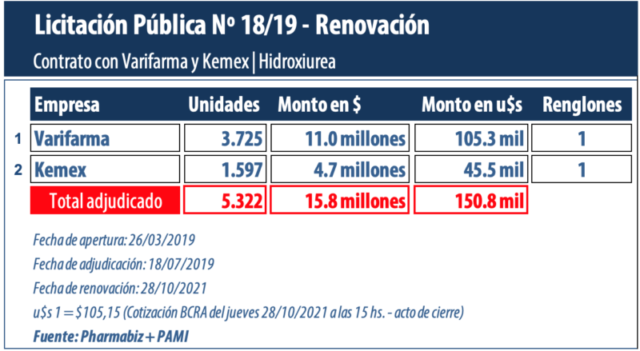 El PAMI renovó la adjudicación de una licitación pública para la adquisición de antineoplásicos a base de hidroxiurea. La compra que implicará un desembolso de $15.8 millones (u$s 150.8 mil) tiene como proveedores a los laboratorios nacionales Varifarma y Kemex.