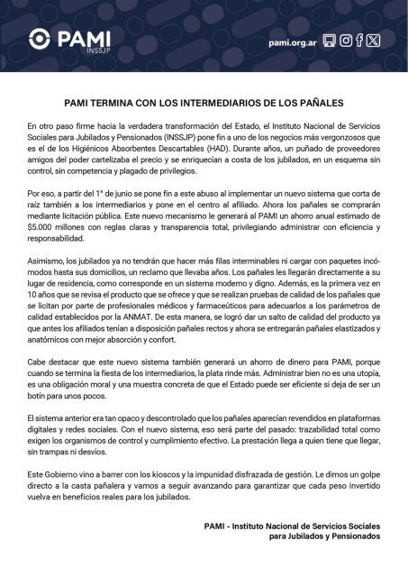 Ahora el PAMI en tanto, emitió un comunicado que afirma que «el sistema anterior era tan opaco y descontrolado que los pañales aparecían revendidos en plataformas digitales y redes sociales». De todas maneras, beneficiarios del PAMI afirman que el sistema a implementar podría traer complicaciones en la entrega, ya que en muchos casos prefieren elegir en qué momento buscar la mercadería. El tema fue parte de la conferencia de prensa de Manuel Adorni este lunes 12 de mayo. Ver comunicado PAMI | Ver Publicación Adorni