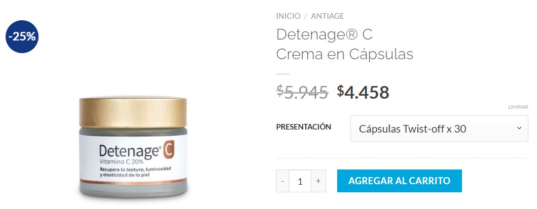El mismo se presenta en los clásicos envases cilíndricos de las cremas faciales, conteniendo 30 cápsulas twist off. Al ser monodosis, se explica, esto permite aplicar la dosis justa y evitar la oxidación de la vitamina C. Detenage C se comercializa en la tienda online de Panalab, a $5.945 (u$s 43,61) aunque actualmente figura a $4.458 (u$s 32,70) con un 25% de descuento aplicado. Ver tienda /