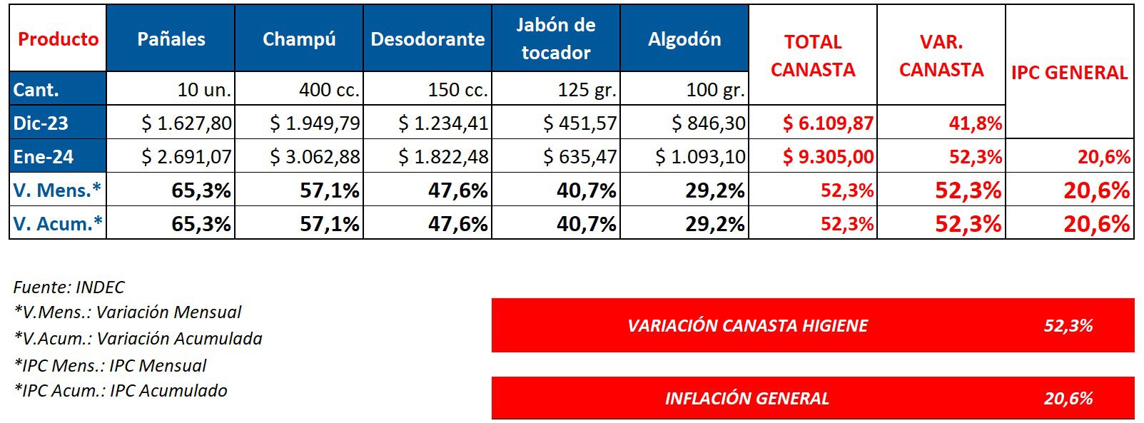 De esta manera, a enero del 2024 adquirir la canasta de higiene configurada por el INDEC implicó un desembolso de $9.305,00 (u$s 10,57). Mientras que en diciembre del 2023 se comercializó a $6.109,87 (u$s 7,10*). Ver artículo Canasta higiene 2023