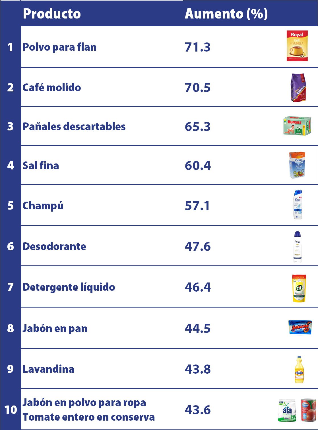 De acuerdo al informe publicado por el INDEC, por fuera de la higiene otros de los productos que estuvieron en el podio de los aumentos fueron la sal fina que subió un 60,4%; el detergente líquido que se incrementó un 46,4%; el jabón en pan lo hizo un 44,5%; la lavandina un 43,8% y el jabón en polvo para ropa un 43,6%. Por último el tomate entero en conserva también un 43,6%.