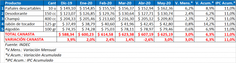 Los productos monitoreados por el organismo público presentaron a su vez un comportamiento dispar durante el quinto mes del año. Así por caso, los pañales descartables registraron un alza muy fuerte que llegó a duplicar el aumento de la canasta de higiene del mes. Los básicos del cuidado del bebé se remarcaron un 6.2% en el segundo mes de neta cuarentena.