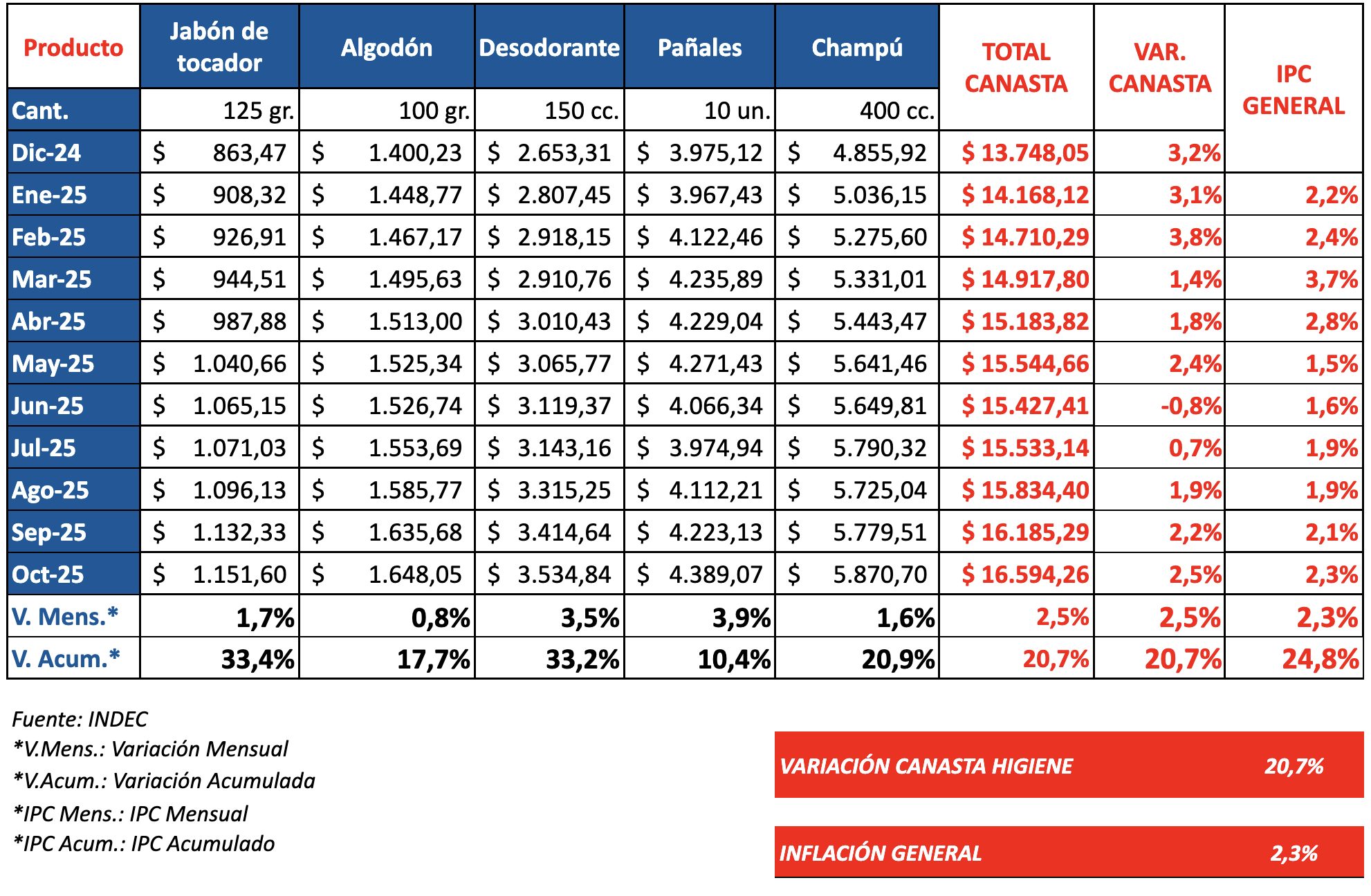 En el décimo mes del año la canasta de higiene osciló 2,5% frente al mes anterior, según los datos publicados por el INDEC. Aunque varios artículos incluidos en este grupo registraron fuertes aumentos y se ubicaron en el top 10 de los productos con más subas. Ver IPC octubre