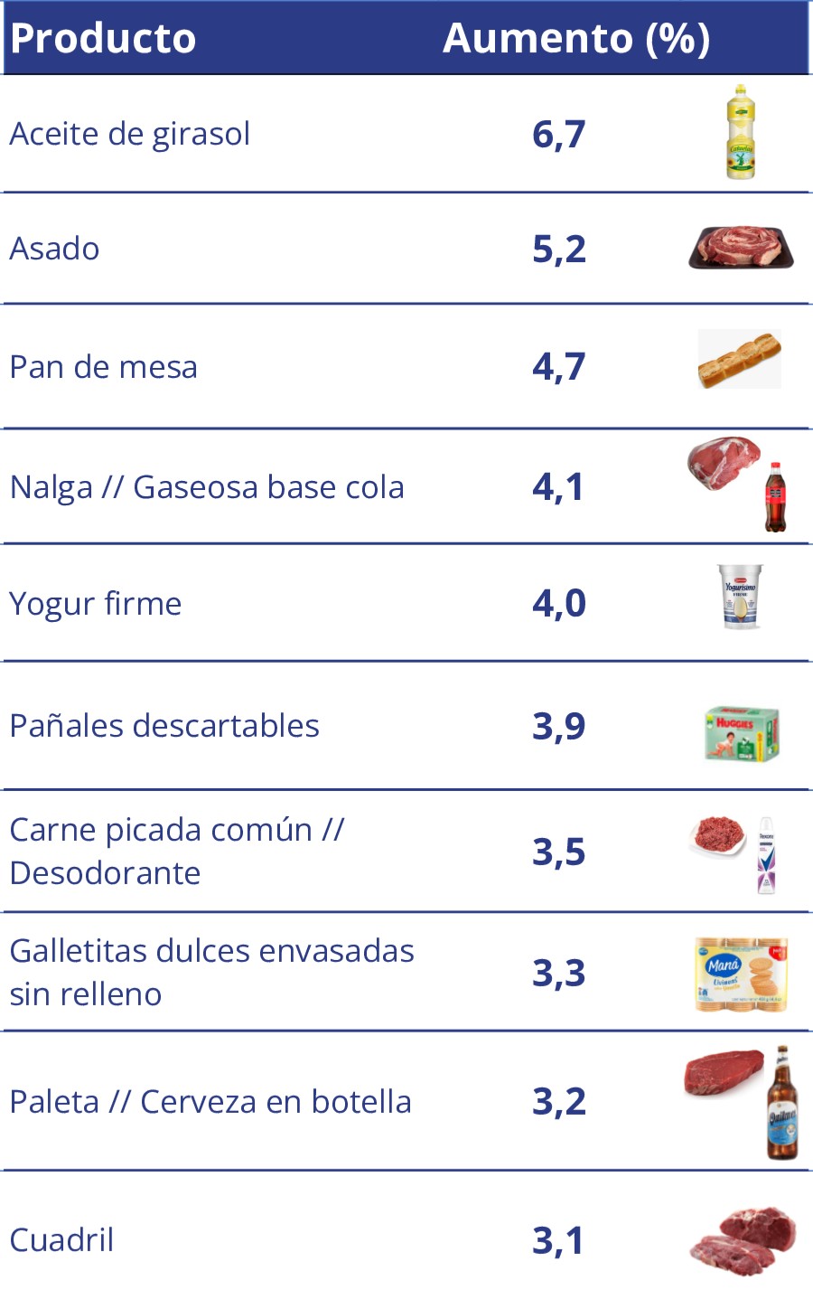 En la canasta general, los productos que más aumentaron fueron el aceite de girasol, que trepó un 6,7%; el asado, que subió un 5,2% y el pan de mesa que aumentó un 4,7% durante octubre.