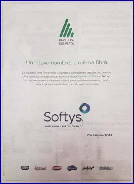 La compañía ligada a la familia Matte salió a los medios locales con un aviso gráfico durante el fin de semana. Fue para anunciar una determinación que impactará en el negocio tissue de CMPC que funcionaba bajo el nombre de Papelera del Plata en la Argentina; Protisa en Perú; Absormex en México; y Melhoramentos en Brasil. Ver publicación.