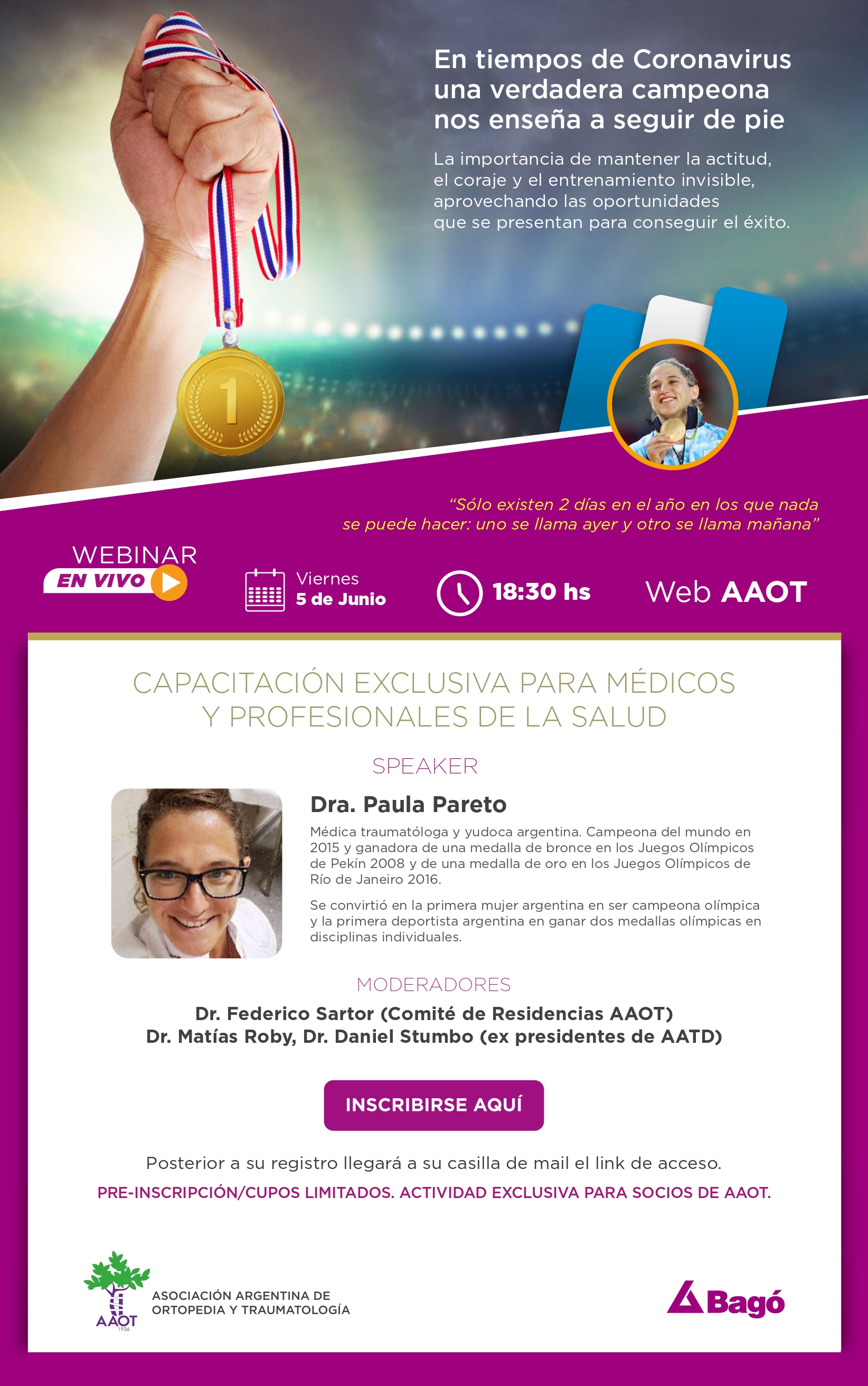 En esta era de trabajo remoto y eventos virtuales, el grupo nacional Bagó está sponsoreando un webinar de la Asociación de Ortopedia y Traumatología. El mismo tendrá como speaker a la médica y yudoca olímpica Paula Pareto.