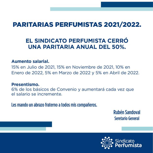El Sindicato de Trabajadores Perfumistas y la Cámara Argentina de la Industria de Productos de Higiene Personal, Cosmética y Perfumería (CAPA) completaron el acuerdo salarial que firmaron a fines de mayo por el período de un año. Ver acuerdo «Inflación del 3,1%, REM noviembre«.