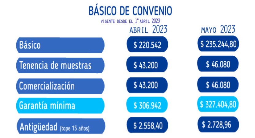 A partir de este nuevo acuerdo, que tiene vigencia retroactiva desde el pasado 1° de abril, un visitador médico percibirá un ingreso mensual mínimo de $306.942 (u$s 1.371,93). Esta cifra está conformada por un básico de $220.542 (u$s 985,75); un adicional de $43.200 (u$s 193,10) por tenencia de muestras; y otro monto equivalente en concepto de comercialización. A esto también se le adiciona un total de $2.558,42 (u$s 11,44) por cada año de antigüedad, con un tope de 15 años.