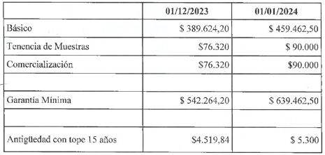 A partir de este nuevo acuerdo, que tiene vigencia retroactiva desde el pasado 1° de diciembre, un visitador médico percibirá un ingreso mensual mínimo de $542.264,20 (u$s 1.419,76). Esta cifra está conformada por un básico de $389.624,20 (u$s 1.020,12); un adicional de $76.320 (u$s 199,82) por tenencia de muestras; y otro monto equivalente en concepto de comercialización. A esto también se le combina un total de $4.519,84 (u$s 11,83) por cada año de antigüedad, con un tope de 15 años.