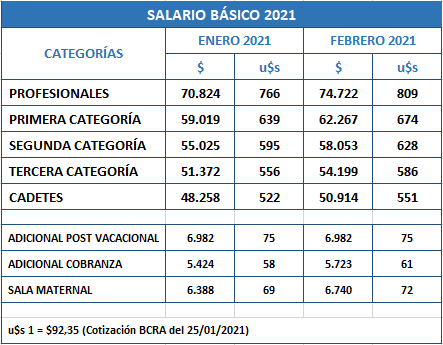 Por último, el acuerdo que tendrá vigencia hasta el 30 de abril del 2021 determinó una «asignación post vacacional» de $6.982 (u$s 75,60) que las empresas abonarán a partir del 1° de este mes. También se fijó un «adicional cobranza» de $5.424 (u$s 57,73) desde enero y de $5.723 (u$s 61,97) desde febrero.