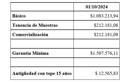 Con este nuevo entendimiento, un visitador médico tiene fijado un ingreso mensual mínimo de $1.507.576,11 (u$s 1.486) en octubre. Esta cifra está conformada por un básico de $1.083.213.94 (u$s 1.068); un adicional de $212.181,08 (u$s 209,2) por tenencia de muestras; y otro monto equivalente en concepto de comercialización. A esto también se le combina un total de $12.565,83 (u$s 12,4) por cada año de antigüedad, con un tope de 15 años.