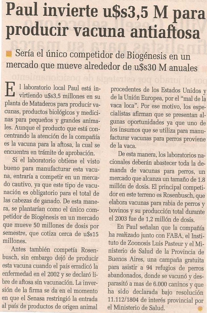 El laboratorio local Paul está invirtiendo u$s3,5 millones en su planta de Mataderos para producir vacunas, productos biológicos y medicinas para pequeños y grandes animales. Aunque el producto que está concentrando la atención de la compañía es la vacuna para la aftosa, la cual se encuentra en trámite de aprobación.