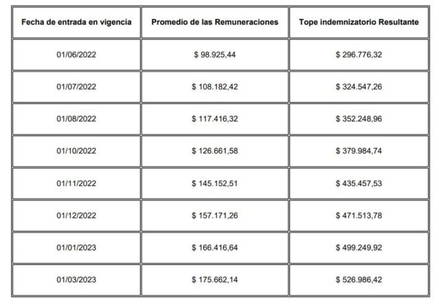 Así, se fijaron máximos indemnizatorios de $471.513,78 (u$s 2.526,73) a partir del 1° de diciembre del 2022; de $499.249,92 (u$s 2.675,37) desde el 1° de enero de 2023; y de $526.986,42 (u$s 2.824) que tendrá vigencia desde el 1° de marzo del presente año. Ver anexo, topes