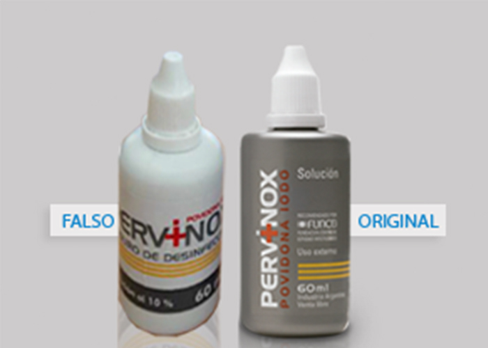 Las unidades falsas de Pervinox solución al 10% por 60 ml con vencimiento junio del 2017 carecen de número de lote y estuche secundario. Además, presentan diferencias significativas respecto de las originales.