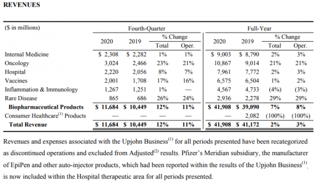Según el reporte financiero, sus ingresos de 2020 aumentaron un 8% en términos operativos impulsado principalmente por los sólidos resultados de Vyndaqel/ Vyndamax para la miocardiopatía; Eliquis en medicina interna; su portafolio de biosimilares oncológicos; Ibrance para cáncer de mama; la vacuna Prevenar 13 fuera de EEUU; Xeljanz para la artritis reumatoide y los oncológicos lnlyta y Xtandi.