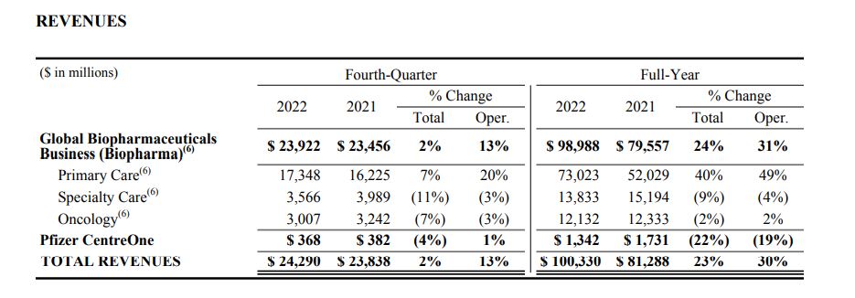 El de 2022 fue otro ejercicio más que positivo para la norteamericana Pfizer a nivel global. La corporación publicó hoy su informe financiero anual en el que detalló que sus ingresos a nivel global ascendieron a u$s 100.330 millones, un 23% por encima de los u$s 81.288 millones que obtuvo en 2021. Se trata del nivel de facturación más alto de toda su historia. Ver Press Release.