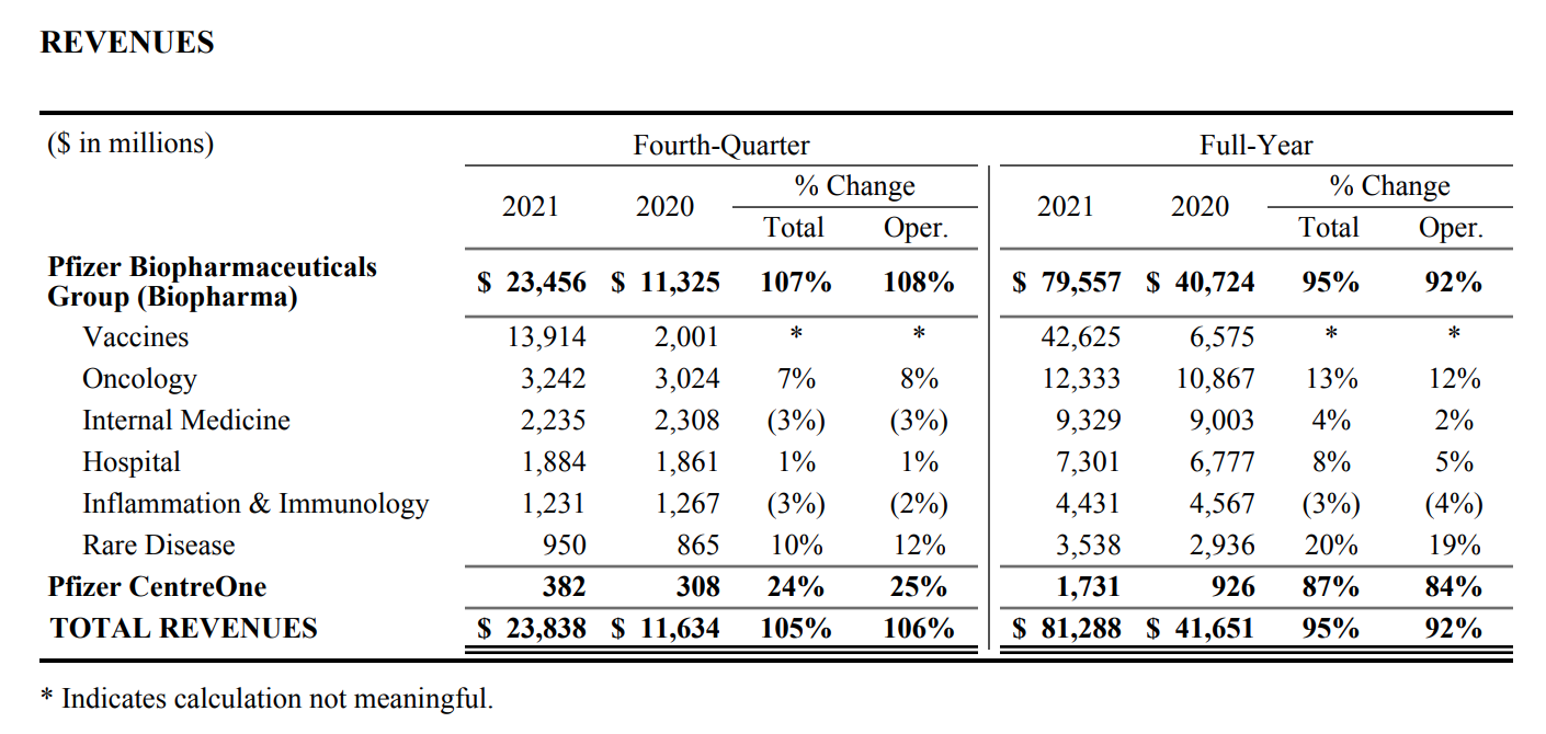 Este desempeño estuvo apalancado principalmente por la vacuna anti COVID-19 que desarrolló en conjunto con BioNTech. La misma, bautizada Comirnaty, le devolvió u$s 36.781 millones frente a los u$s 154 millones que alcanzó en el 2020. Así la vacuna aportó el mayor porcentaje de ventas dentro de su negocio de Vacunas, que en total facturó u$s 42.625 millones, lo que significó más del 100% en comparación con los u$s 6.575 millones reportados en el año anterior.