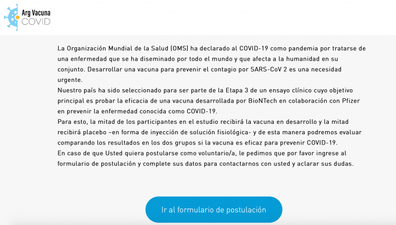 Y mientras la ANMAT nunca hizo oficial la aprobación del ensayo clínico, ni tampoco el Ministerio de Salud, ahora surge una plataforma web bautizada «Arg Vacuna COVID» encargada de reclutar voluntarios de entre 18 y 55 años. En el sitio sin embargo no figura ningún tipo de detalle acerca de quién es el propietario de la página. Únicamente consta que esta web está convalidada por el Estado en el diario Clarín, que según lo expresa en un artículo recibió dicha confirmación desde la agencia regulatoria. Esta información fue relevada luego por otros medios periodísticos. Ver plataforma. Ver artículo del Diario Clarín.
