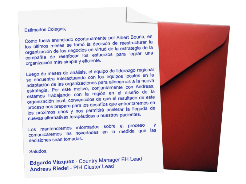 Y aunque todavía no se comunicó formalmente en la compañía, Pharmabiz pudo acceder a la carta enviada hoy al staff de la multi, en la que se consigna oficialmente que se está trabajando con el equipo regional en el diseño de la organización local.