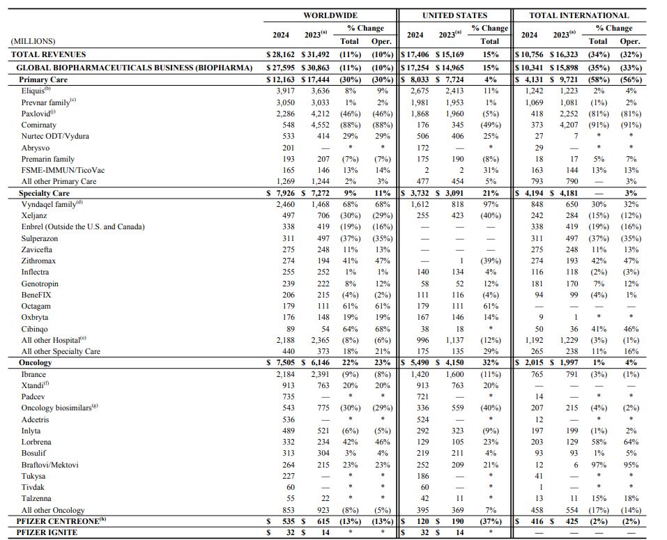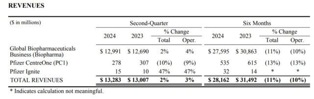 El reporte detalla que en ese período la compañía que tiene como CEO global a Albert Bourla exhibió ventas por u$s 28.162 millones. Esto significa que registró una merma en sus ingresos del -11% frente al mismo semestre del 2023. Ver Press Release