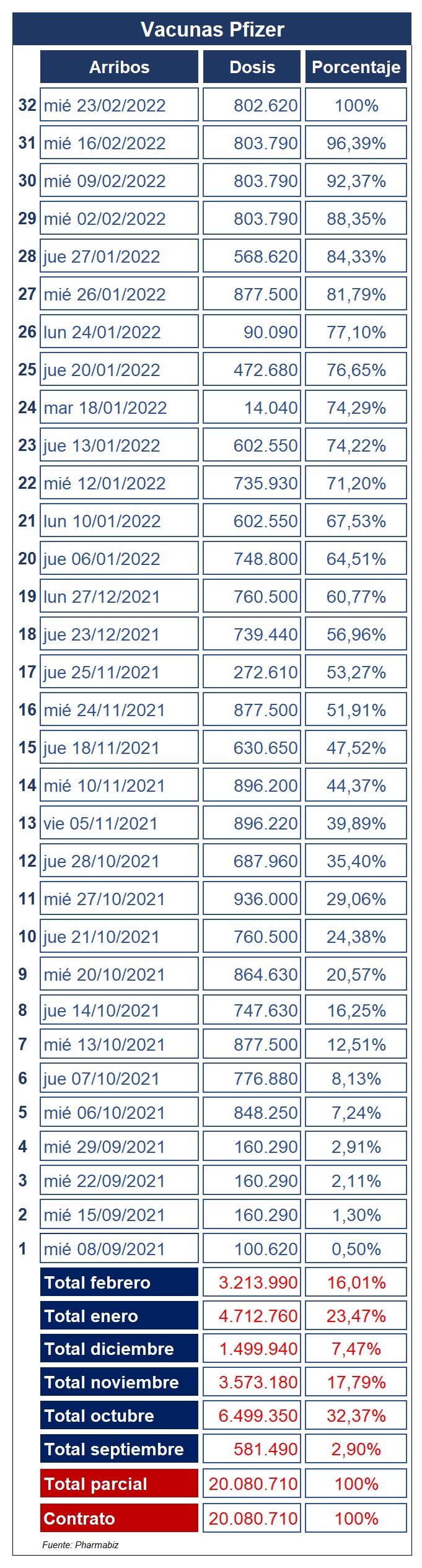 En el remate de febrero se dio por completado el primer acuerdo suscripto entre el Estado argentino y la norteamericana Pfizer. Son 20 millones de vacunas que llegaron en pequeñas tandas desde septiembre del 2021. Al momento ya hay otro corriendo por 18.5 millones de dosis.