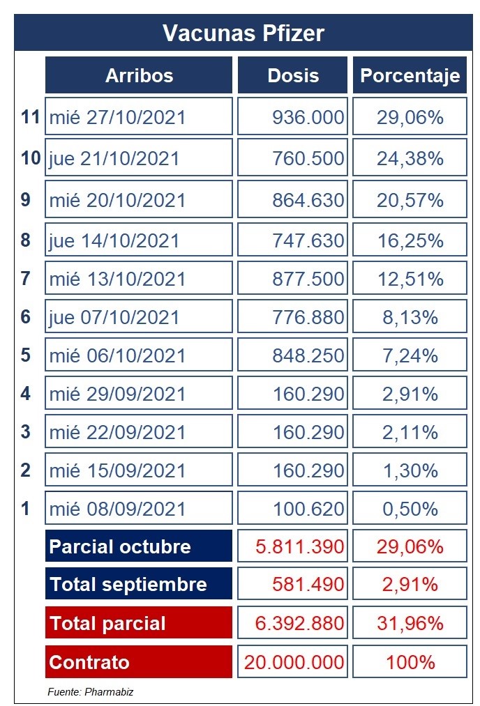 Un nuevo cargamento con 936 mil vacunas del laboratorio Pfizer arribó hoy miércoles al Aeropuerto Internacional de Ezeiza a bordo del vuelo AA931 de American Airlines. Hasta entonces se completó el 29% de lo estipulado en el contrato.