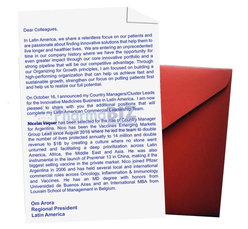 Según pudo saber Pharmabiz, la multi repatrió al argentino Nicolás Vaquer quien actuaba en Nueva York desde hace dos años como vicepresidente de marketing para Vacunas, en un rol que implicaba a Latinoamérica; África; Oriente Medio y Asia. Ver carta.