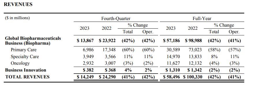El negocio de Primary Care se redujo un -58% a u$s 30.589 millones, frente a los u$s 73.023 millones de 2022. Los ingresos de la vacuna anti COVID-19 que desarrolló en conjunto con la alemana BioNTech se desplomaron un -70% a u$s 11.220 millones. Por su parte, el antiviral Paxlovid, que se convirtió en 2022 en un verdadero blockbuster, presentó una caída del -93% a u$s 1.279 millones.