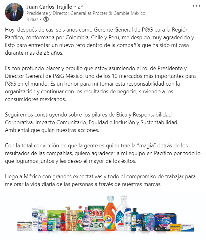 En este segundo semestre del 2021, una de las gigantes de consumo masivo reconfiguró su estructura en América Latina. Se trata de P&G, que designó a Juan Carlos Trujillo como presidente y director general para la operación mexicana.