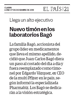 El diario Clarín reflejó hoy la primicia dada por Pharmabiz acerca del nuevo rol de Edgardo Vázquez al frente del laboratorio nacional Bagó.