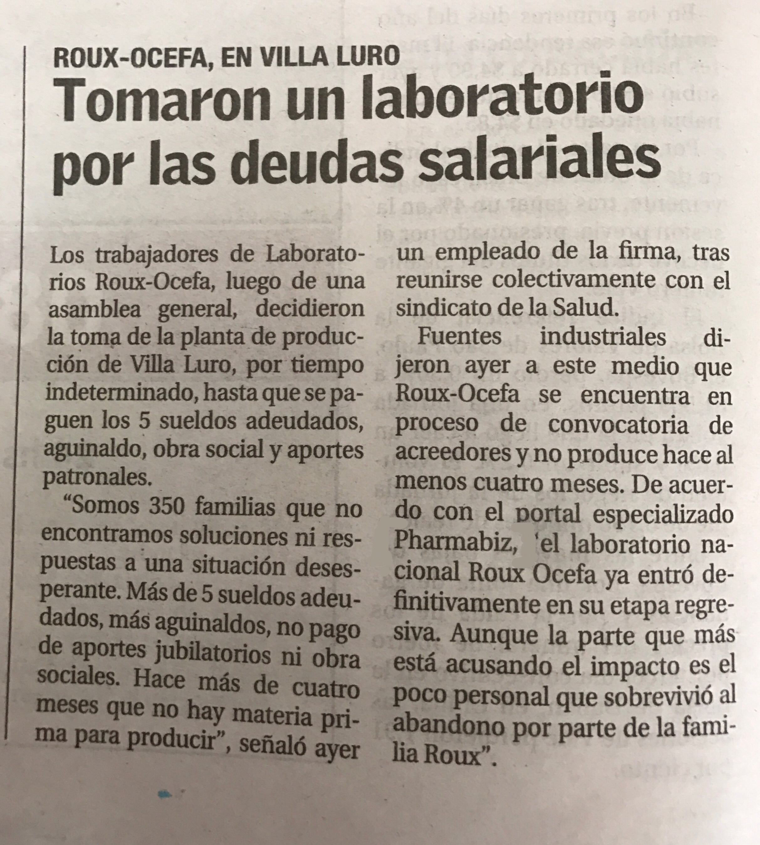 La publicación hace mención a información publicada por este medio especializado que señalaba el inicio de la agonía del laboratorio Roux-Ocefa con dos plantas de producción inactivas y cerca de 200 empleados sin actividad.