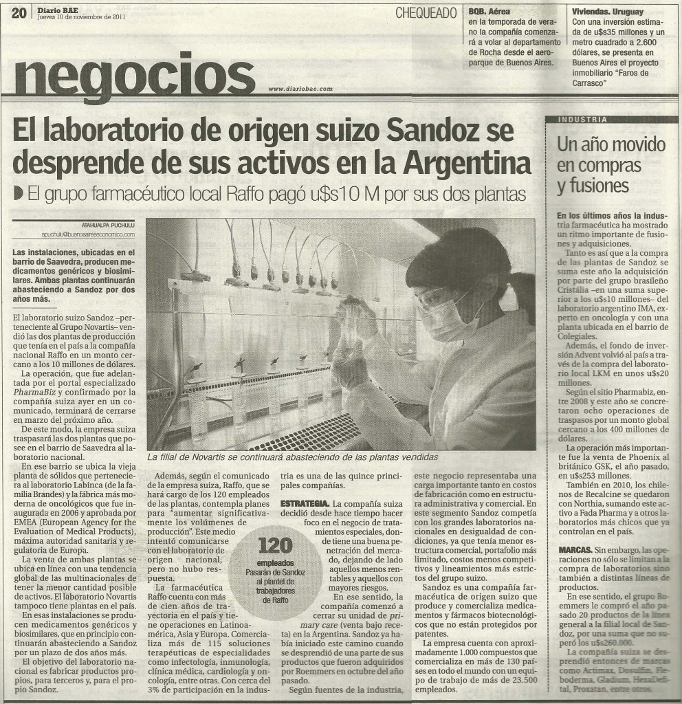 El Diario BAE publicó hoy, jueves 10 de noviembre de 2011 un artículo sobre la venta de las dos plantas de producción del laboratorio Sandoz al nacional Raffo. (Ver artículo)