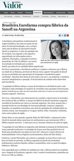 En el día de hoy el prestigioso diario Valor Económico de Brasil tomó como fuente a este medio para publicar la noticia acerca de la compra de la planta local de Sanofi por parte de los brasileños de Eurofarma. Ver artículo.